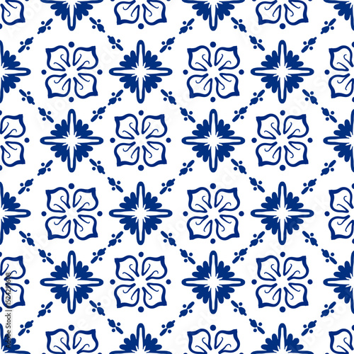 Seamless blue and white tile pattern with hand-drawn brush lines. Traditional Mediterranean design