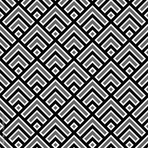 Seamless Chinese window tracery pattern design. Repeated grey rhombuses and angle brackets on black background. Scallop ornament. Image with scales. Ancient japanese scallops motif. Squama. Vector art