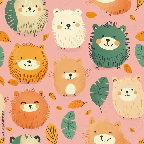 Seamless Kawaii Animal Pattern with Autumn Leaves on Pink Background
