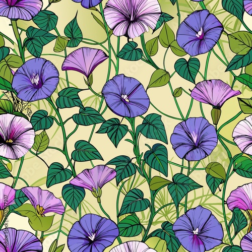 Seamless pattern of dew-kissed morning glories climbing on fences, Generative AI