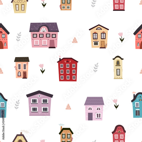 seamless pattern with cartoon houses, flower, decor elements. colorful vector for kids, flat style. Baby design for fabric, textile, print, wrapper.