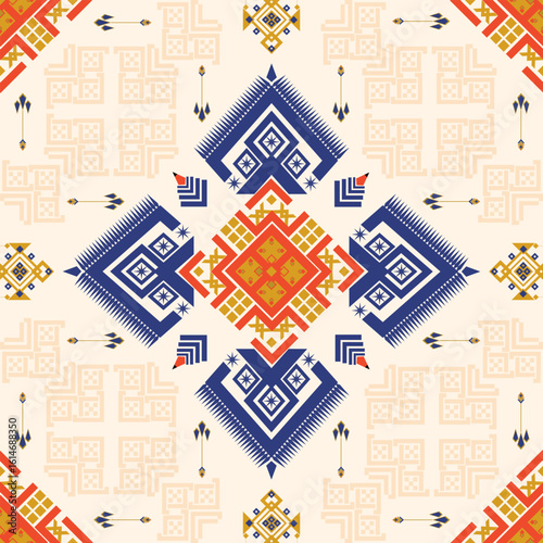 seamless pattern with houses. Seamless tribal print with bold geometric shapes in red, navy, and gold.
