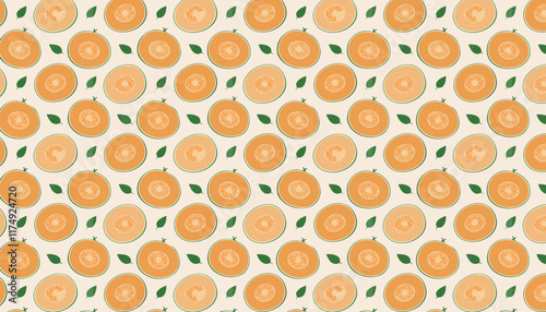 Seamless pattern with musk melon slices and leaves. Vector illustration.