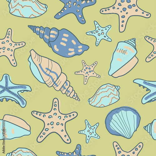 Seamless pattern with seashells and starfishes. Marine background. Vector illustration in sketch style. Perfect for greetings, invitations, wrapping paper, textile, wedding and web design.