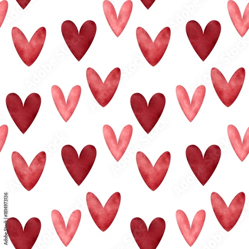 Seamless pattern with watercolor hearts in pink and red tones, isolated on a white background. Hand-painted repeating design for romantic cards, wrapping paper, stickers, textiles.