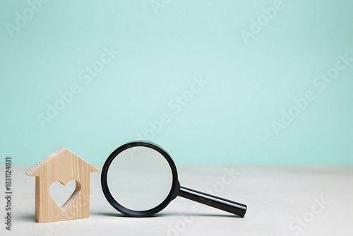 Searching for a Dream Home: A wooden house silhouette with a heart cutout stands beside a magnifying glass, set against a calming light background.