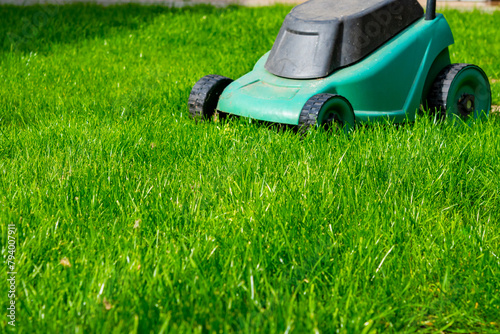 Seasonal maintenance works in garden, lawn movers in action, green grass cutting, lawn care, English lawn