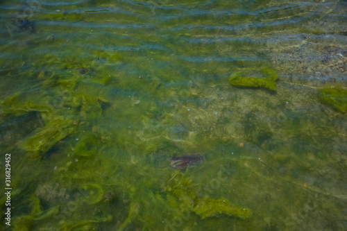 Seaweed on the surface of the water,Green algae pollution on a water surface. Ecological concept,Algae on the surface of the water as a background,Close-up of seaweed/kelp on the waters surface,