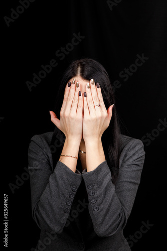 See no evil concept. Portrait of a young scared woman covering eyes with hands, standing on dark studio background. Mixed girl close the eyes with palms while ignoring something