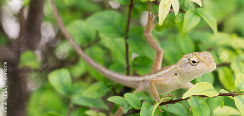 Select eye focus Lizard in thailand. Beautiful Chameleon species in Thailand perched on branch in nature.
