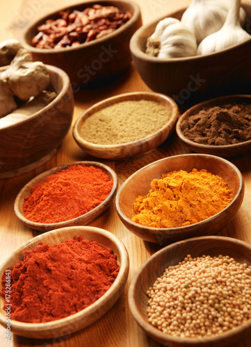 Selection of spices in wooden bowls