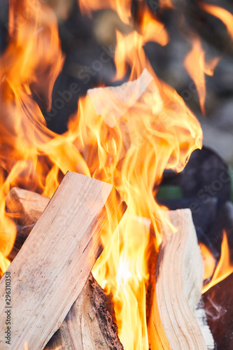 selective focus of firewood with fire flames in grill