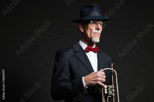 Senior jazz musician. Trumpet player. Studio shot.