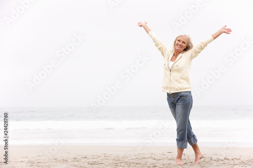 50s, 50s, senior, senior, beach, stretching, arms outstretched, escape, freedom, joy, woman, lifestyle, smiling, run, running, caucasian, female, full-length, holiday, vacation, shore, shoreline, sea, sand, sandy, copy space, people, person, horizontal, portrait, at camera, winter, wintery, casual clothes, fit, healthy, active