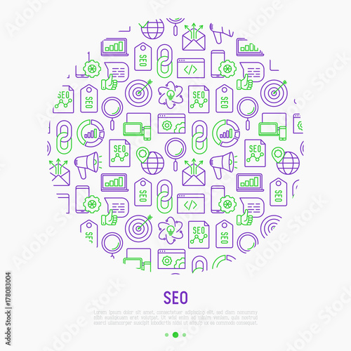SEO and development concept in circle with thin line icons. Vector illustration for banner, web page, print media.
