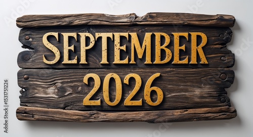 september 2026 lettering on medieval ancient sign wooden board on plain white background