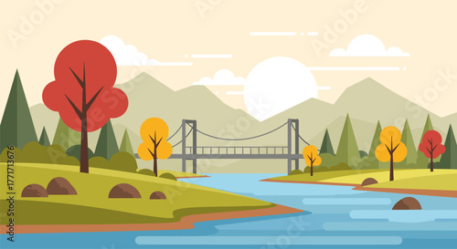 landscape, autumn, river, bridge, tree, flat, mountain, sunrise, calm, nature, scenery, vector, background, park, tranquil, design, illustration, foliage, colourful, forest, season, idylli, environment, wilderness, peaceful, countryside, horizon, high-coloured, vista, fall, flora, panorama, greenery, serene, adventure, exploration