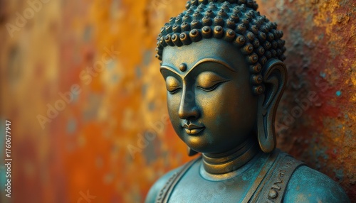 Serene Buddha sculpture in peaceful garden near textured wall
