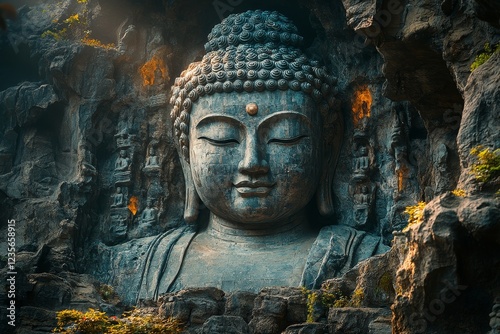 buddha, statue, serene, cliff, sunlight, carving, stone, face, peace, meditation, religion, spirituality, ancient, culture, asia, travel, tour tourism, history, art, sculpture, spiritual, calm, peaceful, calmness, wisdom, nirvana, faith, belief, serenity, mindfulness, yoga, zen, buddhism, temple, mountain, rock, nature, landscape, background, image, photo, photo