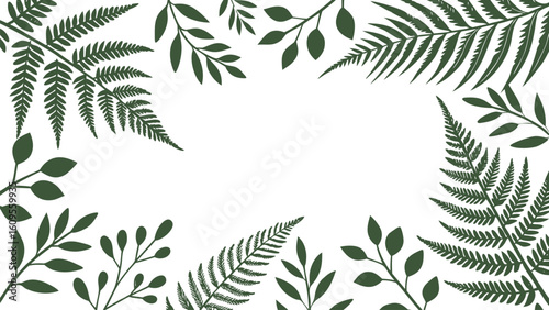leaf, green, fern, botanical, frame, foliage, nature, plant, branch, floral, white, background, design, illustration, pattern, spring, summer, template, border, greenery, organic, simple, elegant, minimalist, vector, silhouette, dark, olive, decoration, card, invitation, wedding, rustic, earthy