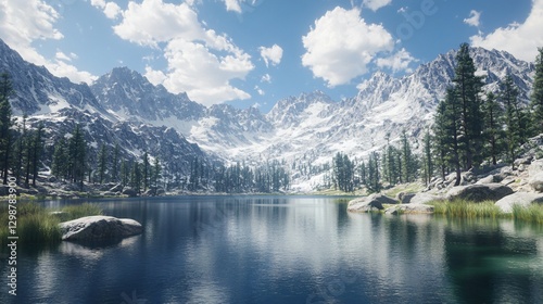 Serene Lake with Majestic Mountain Range View for Travel and Tourist Promotions - Shamrock Stock Photo