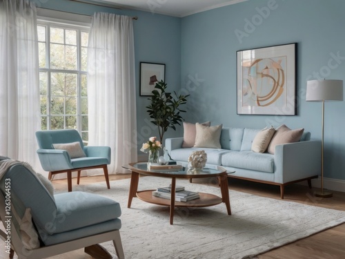 Serene Living Room Featuring Light Blue Sofa and Chairs