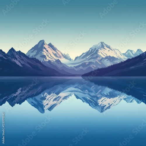 mountain, lake, serene, peaceful, landscape, nature, scenery, water, sky, blue, calm, tranquil, majestic, snow, peak, summit, range, vale, tree, forest, hill, cloud, horizon, stillness, quiet, beauty, wilderness, scenic, view, image, picture, graphic, art, design, digital, illustration