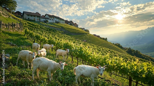 Serene Mountain Vineyard at Sunset with Grazing Sheep Amidst Lush Green Hills and Picturesque Houses in the Background