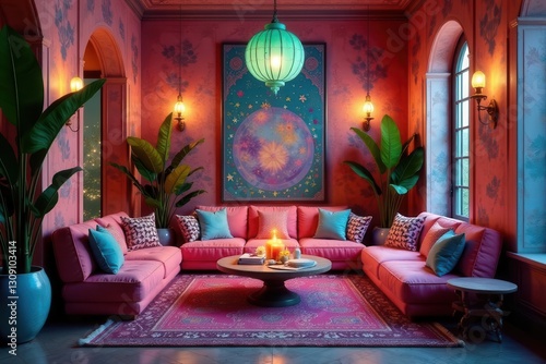 Serene Pink Living Room Interior Design with Vibrant Tapestry and Lush Greenery