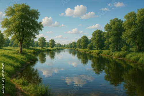 river, scenery, nature, landscape, tree, sky, cloud, water, greenery, peaceful, tranquil, blue, daylight, sunny, outdoors, environment, serenity, beauty, scene, sunlight, natural, calm, summer, idylli, picturesque, clear, view, habitat, ecosystem, atmospheric, scenic, peacefulness, shore, river bank, fresh, bright, flora, calmness, rolling, soft, horizon, vibrant, rural
