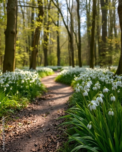 Serene Spring Pathway Through a Snowdrop Flowering Forest