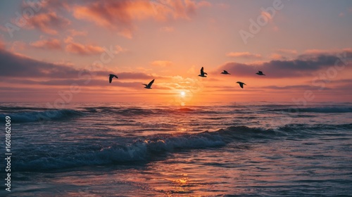 Serene Sunset Over Ocean Waves with Silhouetted Birds in Flight Against Colorful Sky