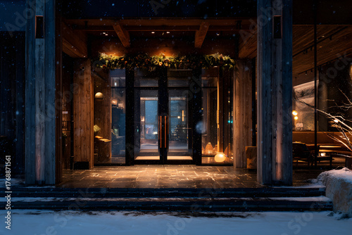 serene, winter, evening, light, snow, entrance, hotel, boutique, calm, peaceful, architecture, design, wood, nature, cosy, warmth, hospitality, atmosphere, seasonal, tranquil, solitude, ambience, modern, entranceway, illuminated, snowflake, outdoors, furniture, glasses, stillness, rustic, retreat, comfort, elegance, welcome, scenic, inviting, filed, isolation, stylish, relaxation, environment, beauty, serenity