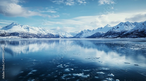 Serene Winter Landscape: Frozen Lake and Snow-Capped Mountains