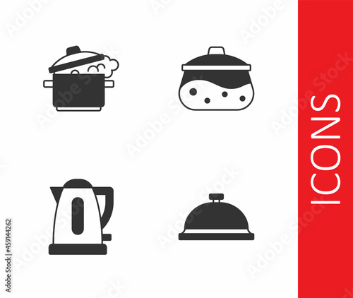 Set Covered with tray of food, Cooking pot, Electric kettle and icon. Vector