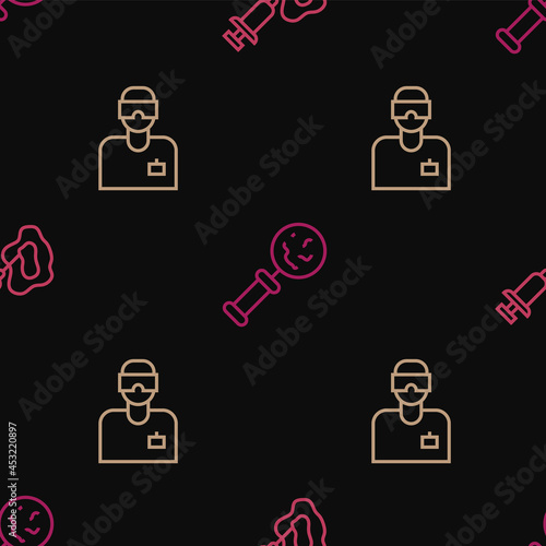 Set line Syringe, Laboratory assistant and Microorganisms under magnifier on seamless pattern. Vector