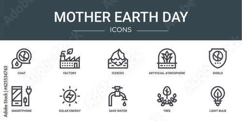 set of 10 outline web mother earth day icons such as chat, factory, iceberg, artificial atmosphere, shield, smartphone, solar energy vector icons for report, presentation, diagram, web design,