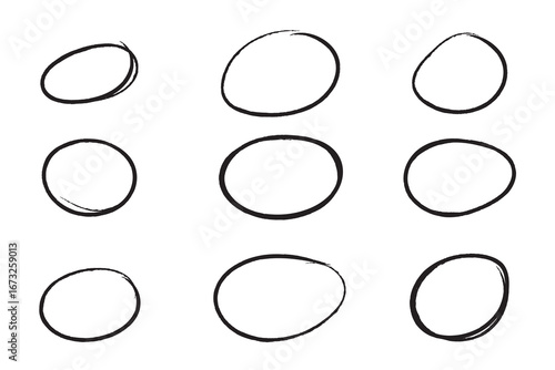 Set of 9 black hand-drawn oval marker circles. Each shape features dynamic sketch strokes on transparent background. Vector EPS 10