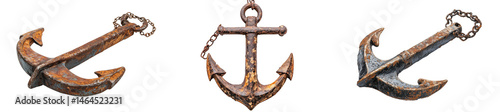 Set of a rusted old ship anchor with chain, isolated on a transparent background.