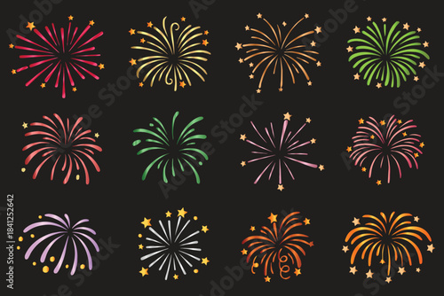 fireworks, explosion, celebration, party, new year, holiday, event, festival, fireworks, cartoon, colourful, vibrant, bright, illustration, vector, graphic, red, green, gold, pink, purple, yellow, orange, dark background, isolated, set, collection, design element, festive, decorative, design, art, graphic design, template, modern, simple, cheerful, joyful, special occasion, anniversary, background, symbol, signs, element