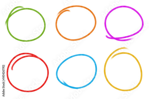 Set of colorful hand-drawn, sketchy, circles red, orange, yellow, green, blue purple circles for annotations, note-taking presentations, etc.