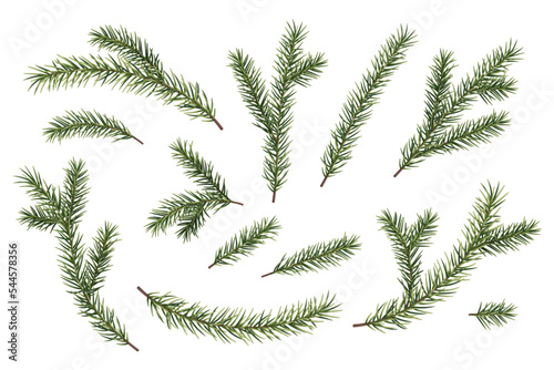 Set of green spruce, pine branches on a white background. Vector fluffy christmas tree branches. Suitable for decor, New Year decoration design