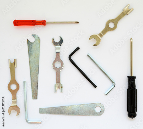 set of locksmith tools, hex keys, box wrenches, wrenches and screwdrivers close-up on a white background