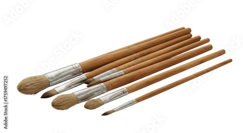 Set of natural wood paintbrushes with soft bristles isolated on white background, perfect for artists and painters