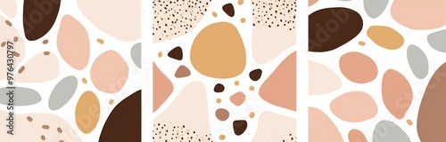 Set of Three Abstract Flat Vector Terrazzo Patterns in Earthy Tones on White Background – Warm Colors and Rounded Geometric Shapes
