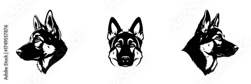 Set of Three Striking Black and White German Shepherd Dog Head Illustrations for Pet, Security, and K9 Logos