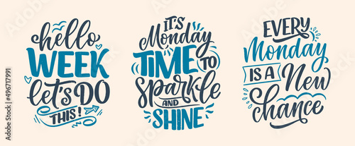 Set with hand drawn lettering quotes in modern calligraphy style about Monday. Slogans for print and poster design. Vector