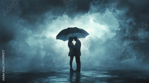 Sheltered by Love - Couple Embracing Under Umbrella in Storm, Symbolizing Emotional Protection and Affectionate Care