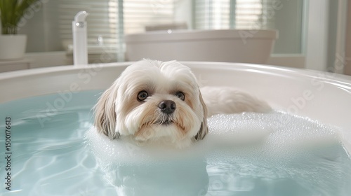 Shih Tzu dog soaks in a bubbly bathtub with water and looks forward. - high quality Shih Tzu dog soaks in a bubbly bathtub with water and looks forwar