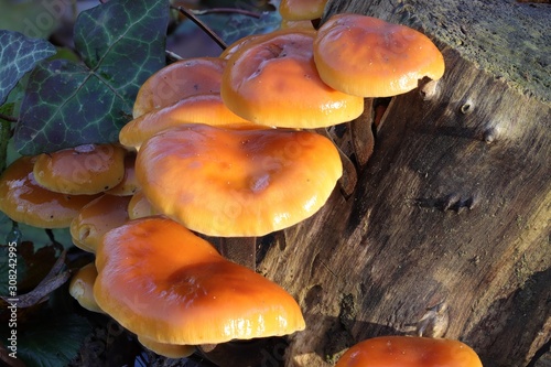 Shiny brown wax cap mushrooms growing on an old tree stump